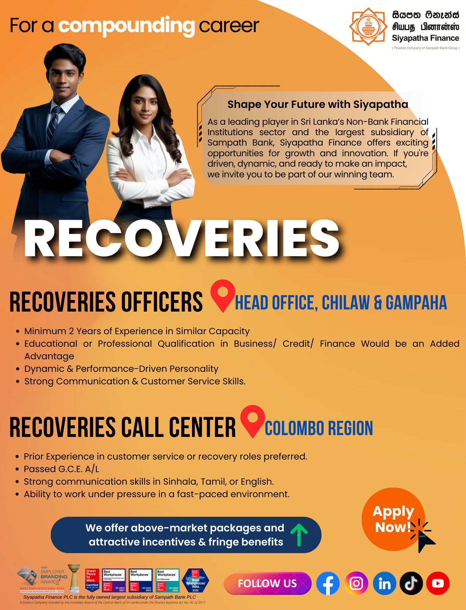 Siyapatha Finance PLC is a fast growing finance company which operates as the largest subsidiary of Sampath Bank PLC. We are currently catering in to diversified market segments through our product portfolio. Our Vision is to be the most innovative and trusted premier financial service provider.
