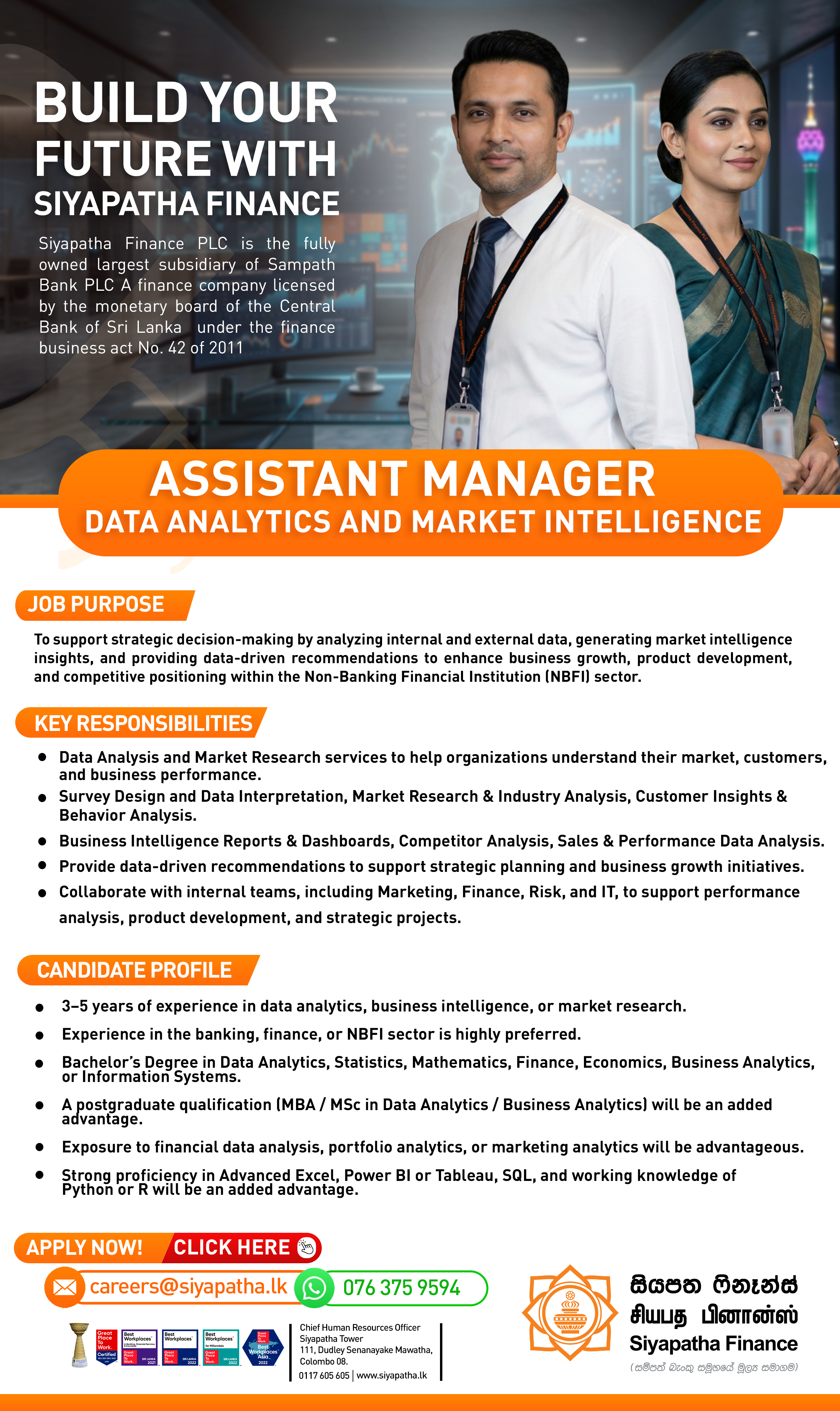 Siyapatha Finance PLC is a fast growing finance company which operates as the largest subsidiary of Sampath Bank PLC. We are currently catering in to diversified market segments through our product portfolio. Our Vision is to be the most innovative and trusted premier financial service provider.